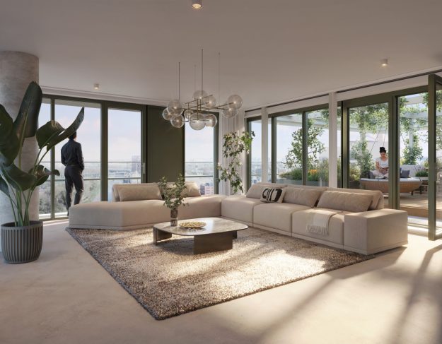 The Emerald heeft een enorme variatie in type appartementen (totaal 121 stuks) gekregen. Maisonnetes in de plint, prachtige overhoeks georiënteerde appartementen, studio’s en aan de grote getrapte dakterrassen liggen penthouseappartementen met op hun dak zonnepanelen en buffering van regenwater. Bijzonder is de tweede lage toren; een haast zwevende toren waar de “Kalverstraat” onderdoor gaat. Zes verdiepingen, slechts steunend op één poot.